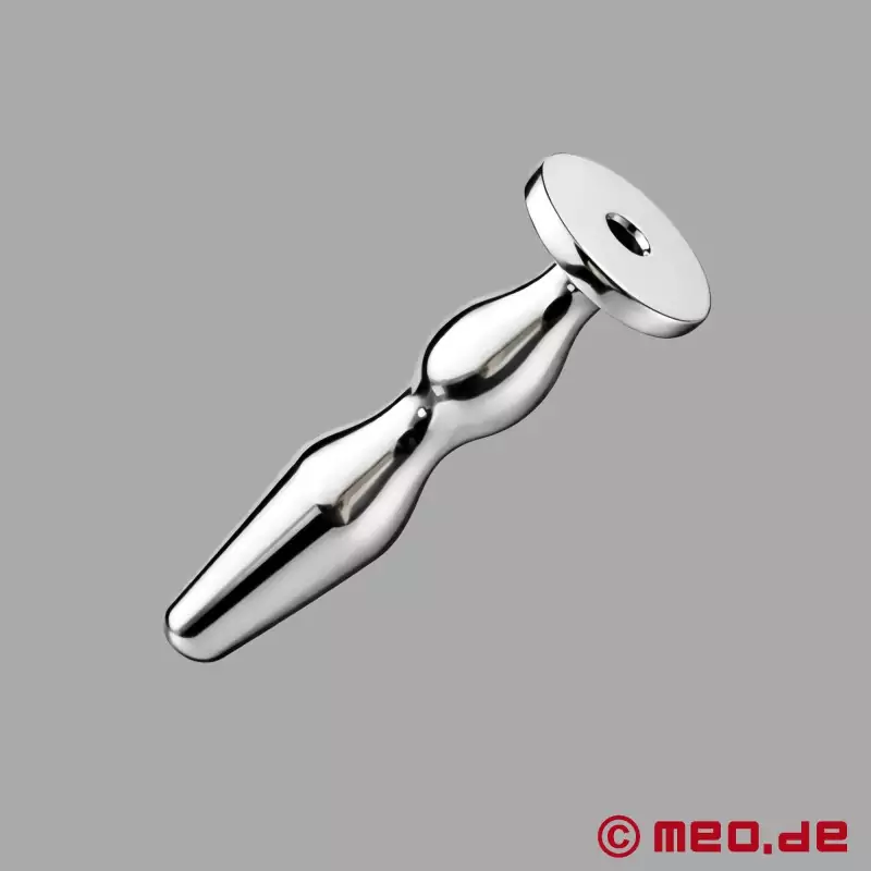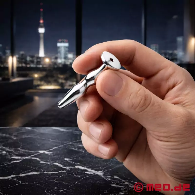 Tehnični podatki: Vtič za penis z odprtino. CNC-izdelan čep za penis iz medicinskega nerjavnega jekla. Čep za penis z izjemno veliko končno ploščico (približno 15 mm). Skupna dolžina približno 50 mm, od tega se lahko vstavi 45 mm. Največji premer približno 9 mm. Odprtina skozi luknjo.