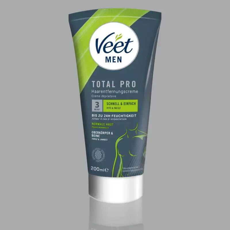 Krema za odstranjevanje dlak Veet Men Total Pro™ je bila razvita posebej za potrebe moške kože. Hitro in učinkovito odstranjuje neželene dlake na telesu. Krema zagotavlja opazno gladko kožo, vlaži do 24 ur in omogoča odstranjevanje dlak na zgornjem delu telesa in nogah brez nevarnosti ureznin, kot se lahko zgodi pri britju.