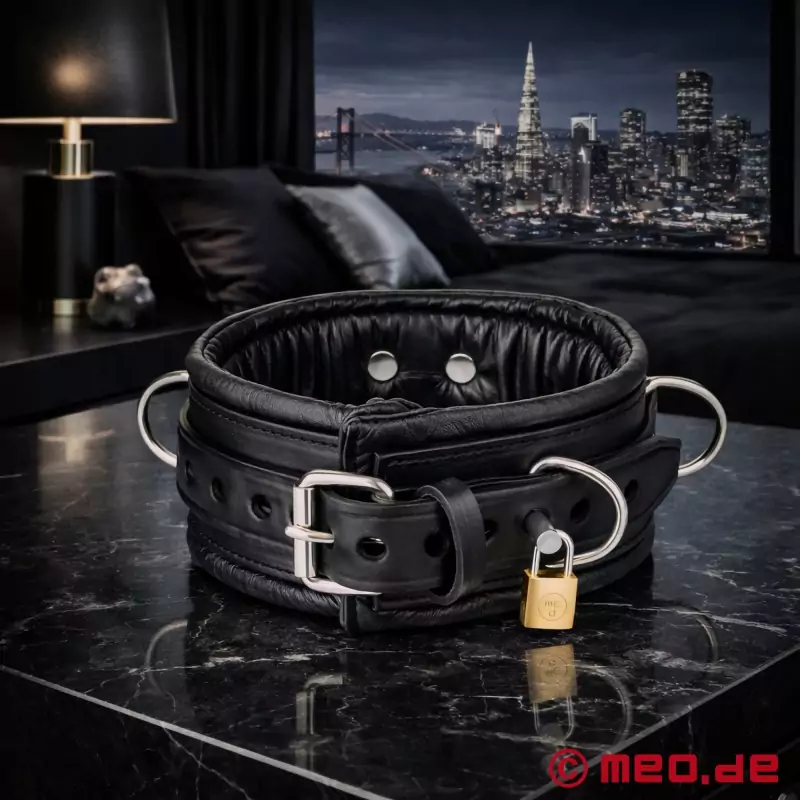 Ta čudovit pripomoček za bondage je zelo kakovostna ovratnica BDSM, izdelana iz črne polnozrnate goveje kože, ki je bila izdelana z veliko pozornostjo do podrobnosti. Kot vsi naši izdelki iz uspešne serije "San Francisco" je tudi ta mehka oblazinjena ovratnica zaklepljiva.