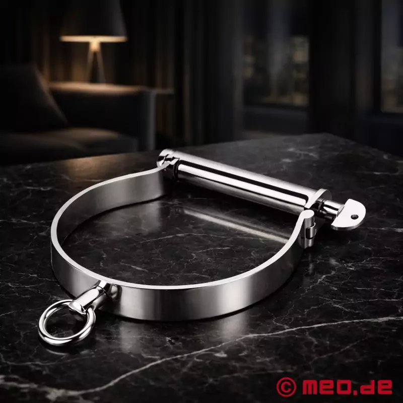 Težka ovratnica Darby Style navdušuje z visoko polirano površino, zato ni le učinkovita ovratnica BDSM za poniževanje in omejevanje, temveč tudi eleganten nakit. Ta ovratnica za BDSM pritegne pozornost na fetišističnem dogodku ali kot stalni simbol podrejenosti. Robusten O-obroček na sprednji strani je idealen za povezavo s povodcem za sužnje ali za pritrditev sužnja na fiksne predmete, kot so pohištvo ali stenska sidra.