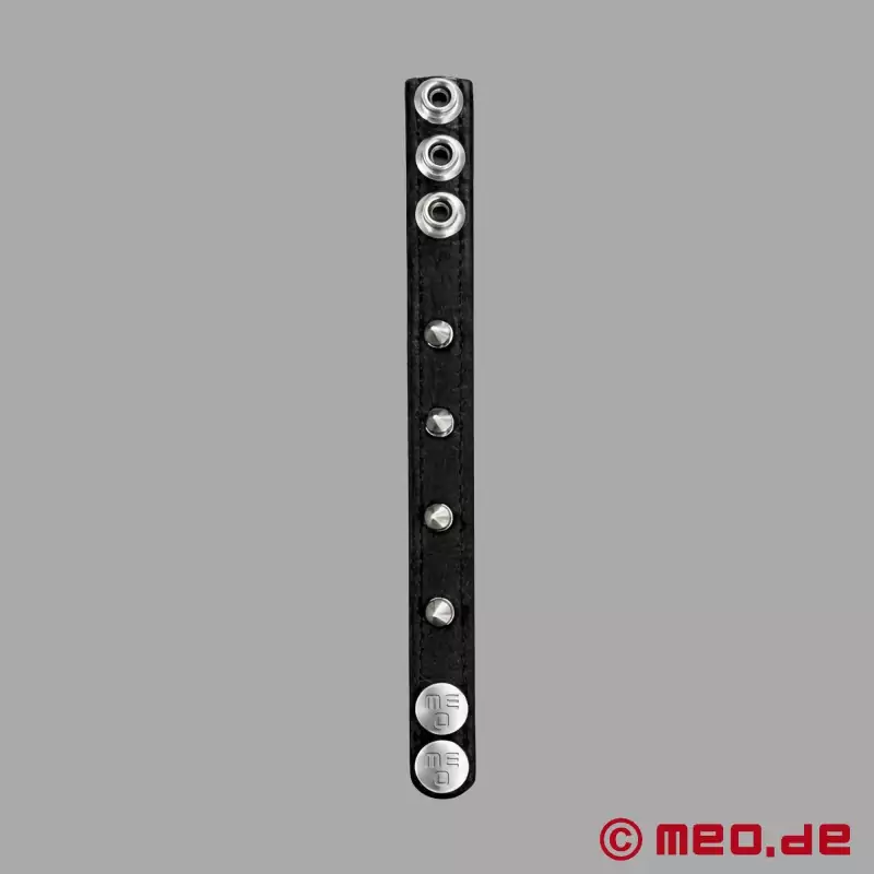 Zahvaljujoč nastavljivim pritisnim čepom ima ta usnjeni obroček za penis vedno trden oprijem na vaših "družinskih draguljih" in vsem daje vedeti, da ste za grob seks!