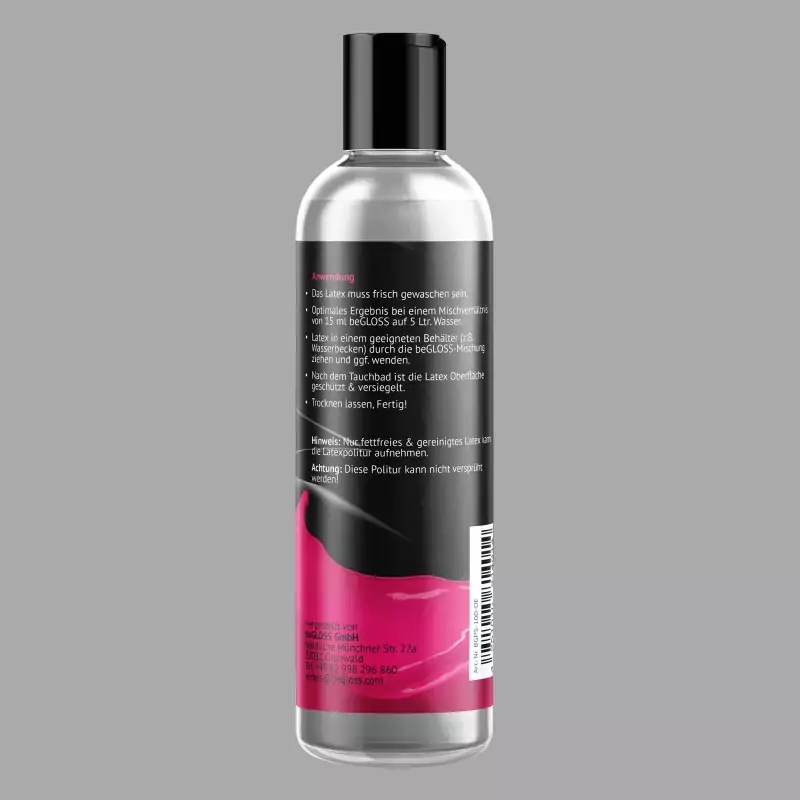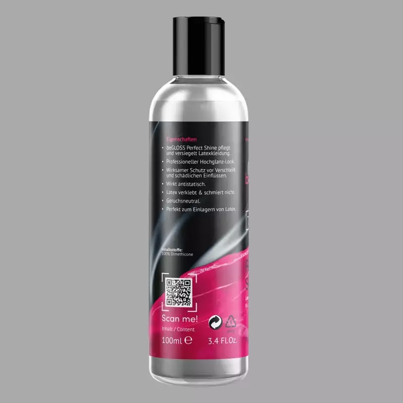 beGLOSS® Perfect Shine™ & Sensitive Care™ je lak za nego na osnovi silikona, ki po pranju zapečati oblačila iz lateksa ter jih zaščiti pred obrabo in škodljivimi vplivi. Zatesnitev daje lateksu poseben sijaj in prožnost za seksi videz z visokim sijajem. Izdelano v Nemčiji.