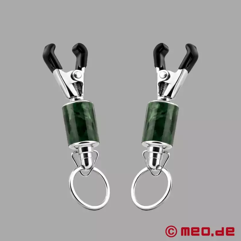 Objemke za bradavičke so vizualno impresivne zaradi kombinacije svetleče kovine, črnih konic objemk in okrasnih zelenih okrasnih elementov. Rezultat je funkcionalen pripomoček BDSM z edinstvenim značajem - natančen, robusten in učinkovit.