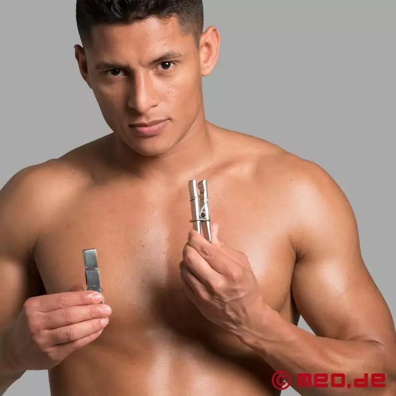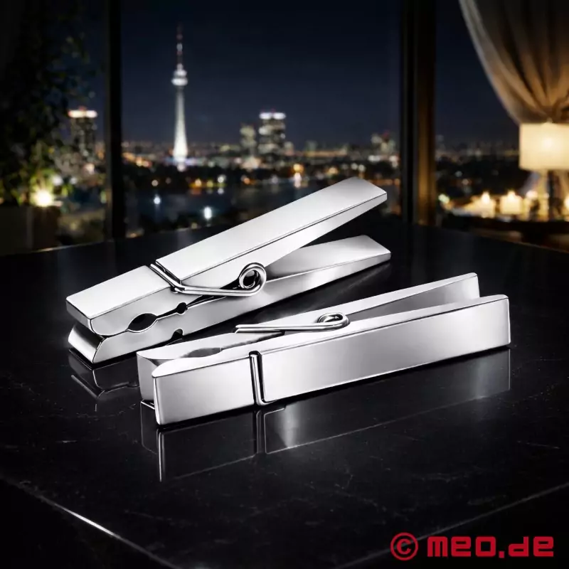Hladno, težko jeklo se sreča z občutljivimi, trdimi bradavicami. Razkošne objemke za bradavičke združujejo močan oprijem klasičnih sponk za oblačila s trdno težo nerjavečega jekla. S skupno težo 170 gramov imajo te objemke za bradavičke intenziven učinek, ki ga je jasno čutiti pri vsakem gibu.