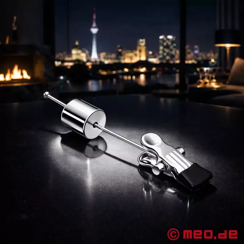 Ta posebno kakovostna objemka za bradavičke je ročno izdelana iz nerjavečega jekla. Osnova je robustna objemka BDSM s plastično prevleko, ki ščiti bradavičke. Posebnost te objemke za bradavičke je 150-gramska utež iz nerjavečega jekla, ki se lahko prosto premika naprej in nazaj na približno 10 centimetrov dolgi kovinski palici. Ta utež ne zagotavlja le dodatnega oprijema sponke za bradavice; ta mali "zlobnež" razvije svojo polno moč, ko je utež potisnjena navzgor in nato hitro in nenadoma spet pade navzdol - senzacionalen občutek, podoben prasketanju biča: "Kawumm"! Nastali impulz deluje neposredno na najobčutljivejše predele in ustvari intenziven, točen stimulativni učinek, ki se z vsako ponovitvijo stopnjuje.