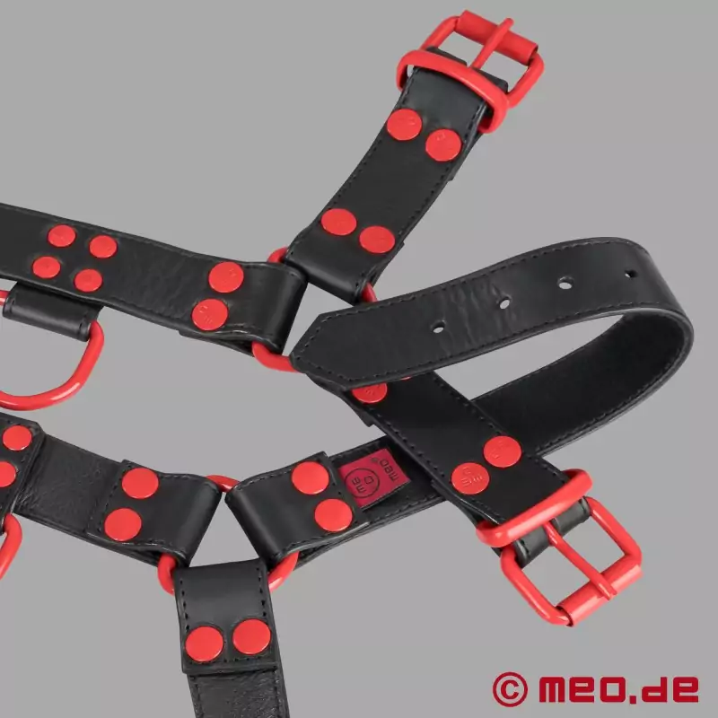 Ta črno-rdeči usnjeni pas iz usnja MEO® je prva izbira za vse, ki želijo vidno in samozavestno pokazati svoje spolne preference. Postroj FetishGear™ v črno-rdeči barvi z rdečimi detajli daje jasno vedeti, da je moški, brezkompromisen in ustvarjen za močne predstave.