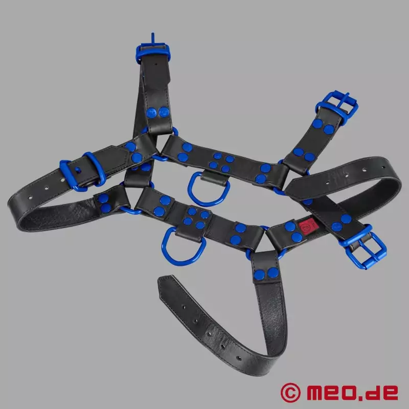 Ta črno-modri usnjeni pas iz usnja MEO® je prva izbira za vse, ki želijo vidno in samozavestno pokazati svoje spolne preference. Postroj FetishGear™ v črni/modri barvi z modrimi detajli daje jasno izjavo - je moški, brezkompromisen in narejen za močne predstave.